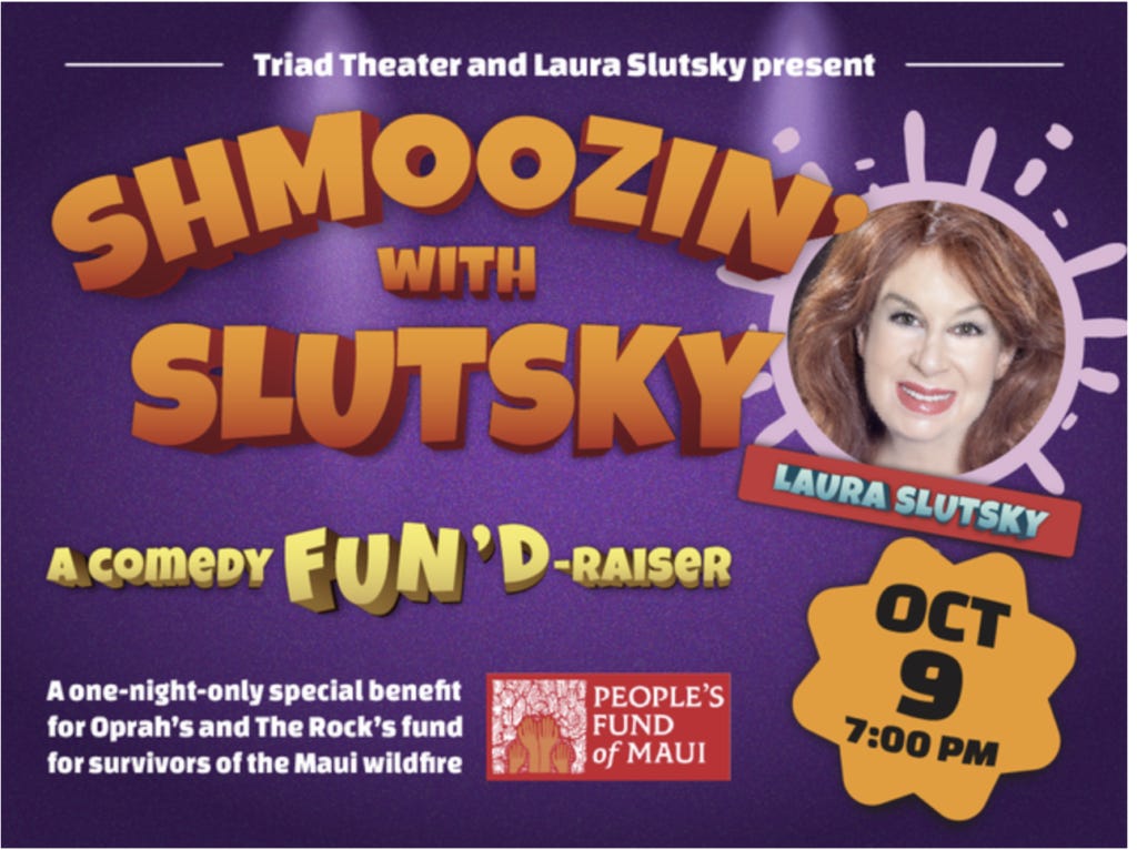 This month she did a fundraiser at The Triad Theater to raise money for the survivors of the Maui wildfires. It was a comedy/variety show that she hosted with comedians like Jamie deRoy, Nancy Parker and Todd Stone, … half of The Stone Brothers, and it was a really fun evening and a great success!!!